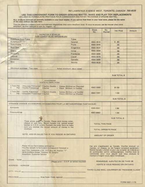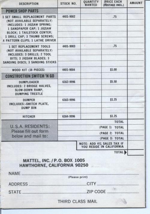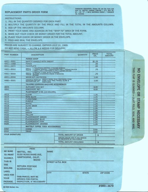0001-3670 | Replacement parts order form | 1968 | Mattel |