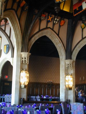 We made reservations for all of our meals on the first day that they allow reservations to be made. If you are staying at a Disney hotel you can make the reservations 60 days in advance. It is best to call in for each day of the trip as the 60 days point hits. The priority seating slots fill up fast. Here is the dining room as seen from Fantasyland (the row of windows on the second floor) and also the interior of the dining hall.