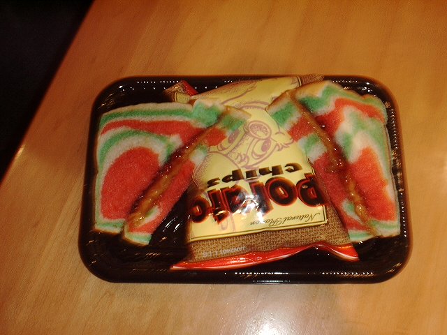 On the way back to the Polynesian we stopped at the Wilderness Lodge to look around. This is a really neat hotel. I wish it were on the monorail. We ate in the Roaring Fork (?) snack bar. Get a load of the peanut butter and jelly sandwich!