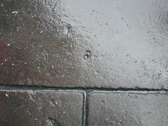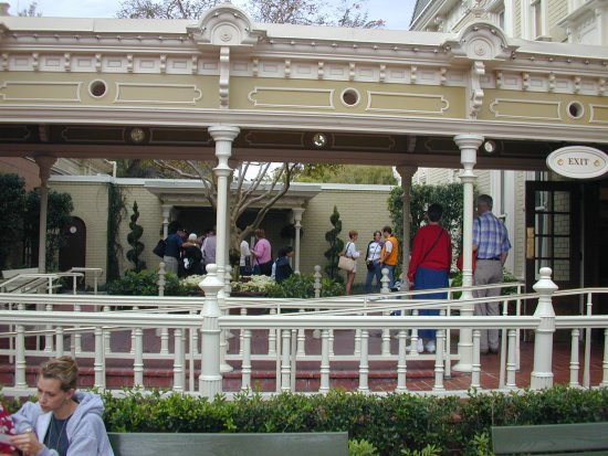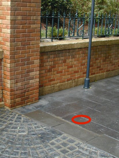 The tour went to the Haunted Mansion for a detailed description of the story. She showed us the wedding ring embedded in the pavement when the bride threw herself out the window. We entered the ride through the service hall. We had never been in this way before. It is not the wheelchair entrance, we had been in that way before. Here are two pictures of the wedding ring. One is to show the location and the other is a close-up of the ring. I hope I put the red circle around the right place. If not, it is close.