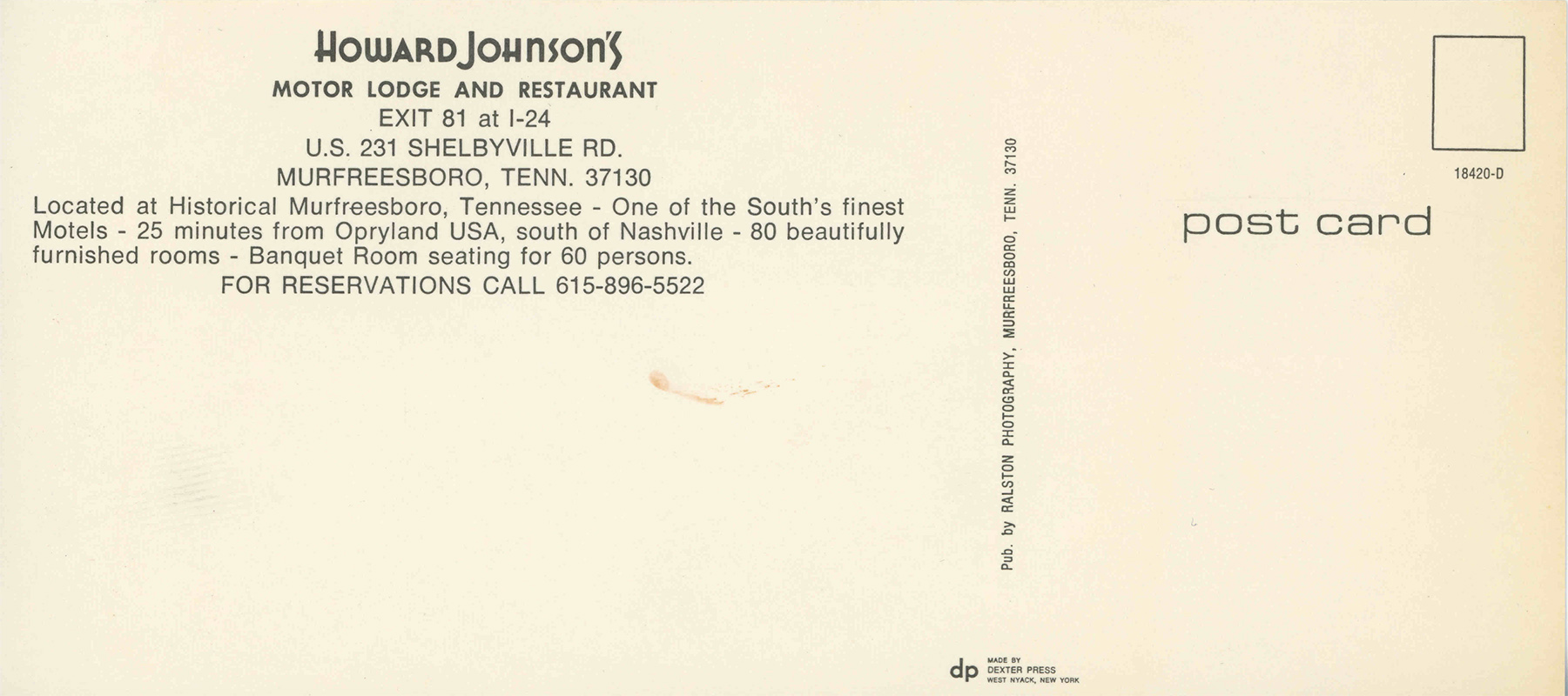 | Howard Johnson's Motor Lodge and restaurant Murfreesboro, Tennessee 18420-D