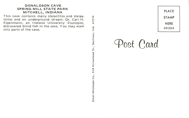 ![]() Donaldson Cave Spring Mill State Park Mitchell, Indiana 49304 Estell Wholesale Co | ||