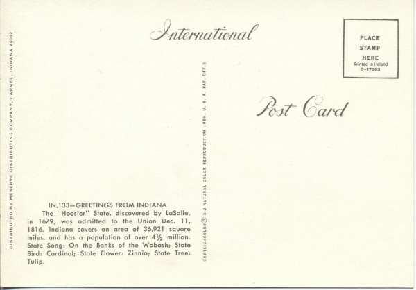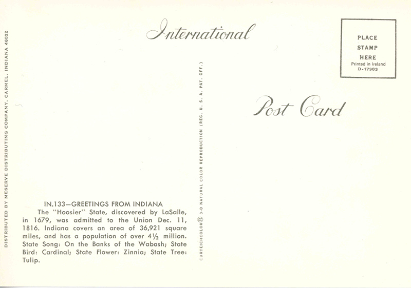 ![]() Indiana The Hoosier State IN 135 D-17985 Curteichcolor | ||