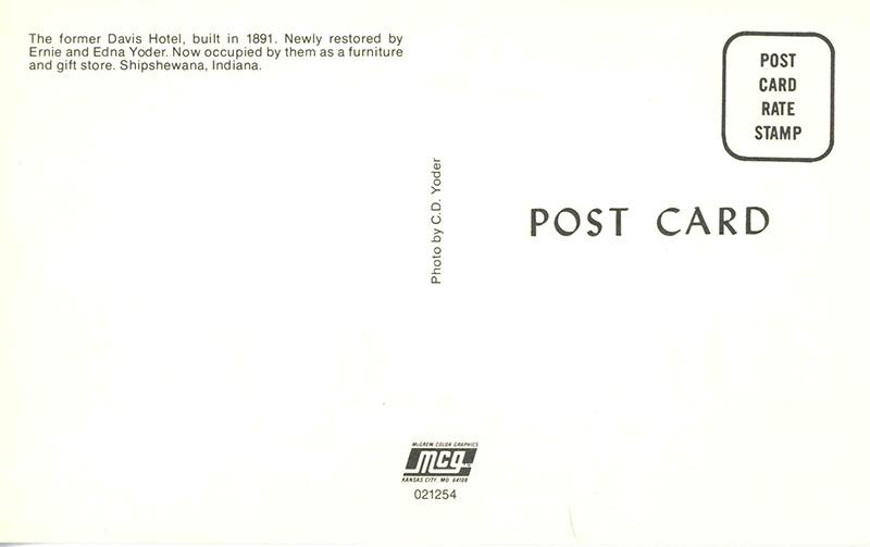 ![]() The former Davis Hotel Shipshewana, Indiana 021254 McGrew Color Graphics | ||