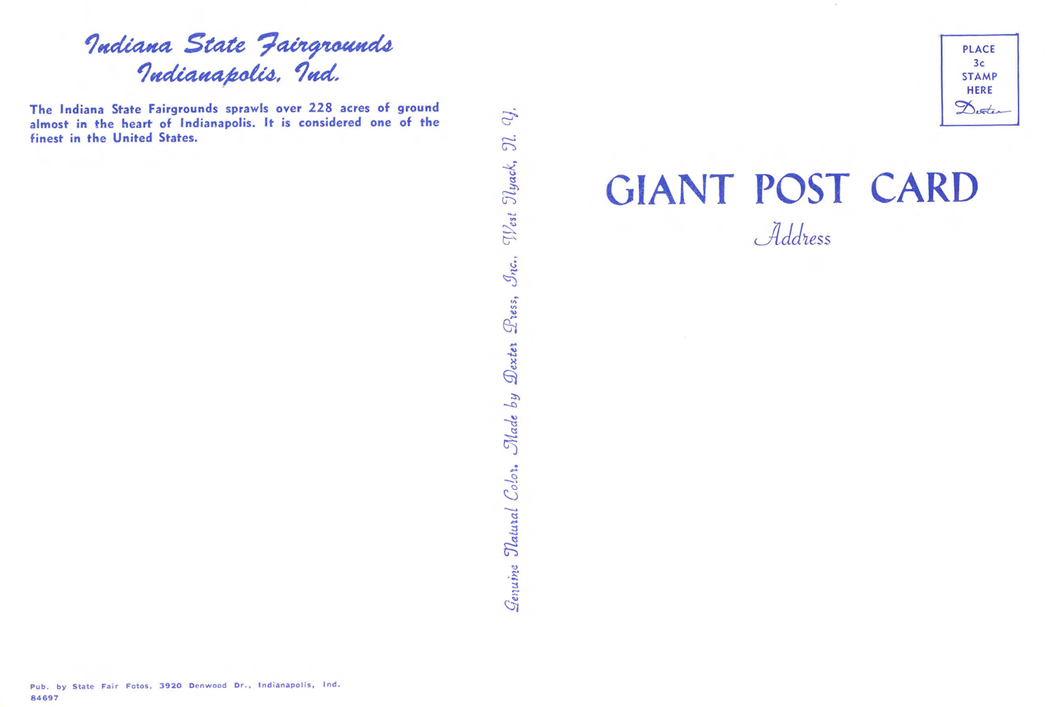 Indiana State Fairgrounds, Indianapolis, Ind. The Indiana State Fairgrounds sprawls over 228 acres of ground almost in the heart of Indianapolis.