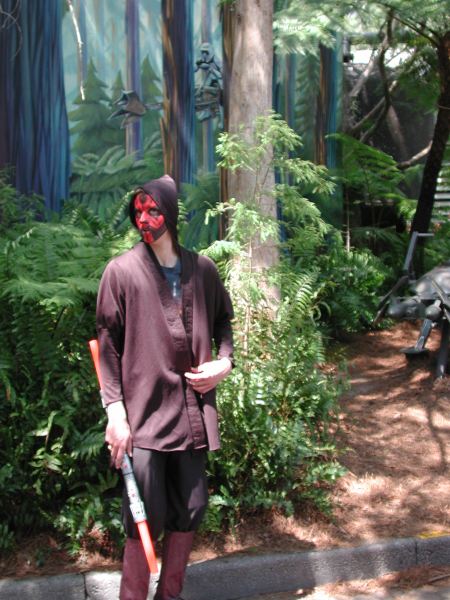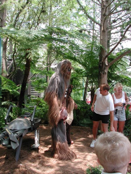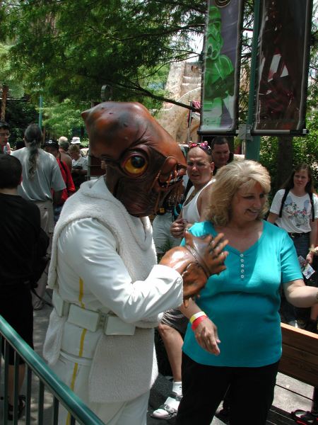 Disney had set up a Star Wars arcade in a room of the Backlot Express, between Star Tours and Indy Jones. It had many old and new Star Wars themed video and pinball games. The new Episode I pinball game is really cool. It has a video screen near the back of the playing field that is incorporated into the pinball play. It was now time to head for Mike Quinn's autograph session. His was running behind because he never took a break. He just kept signing and posing for pictures as long as there were fans around. He really got into the Star Wars weekend, unlike an unnamed princess a couple of weeks before. While waiting in line we watched all of the Disney Star Wars characters walking around.