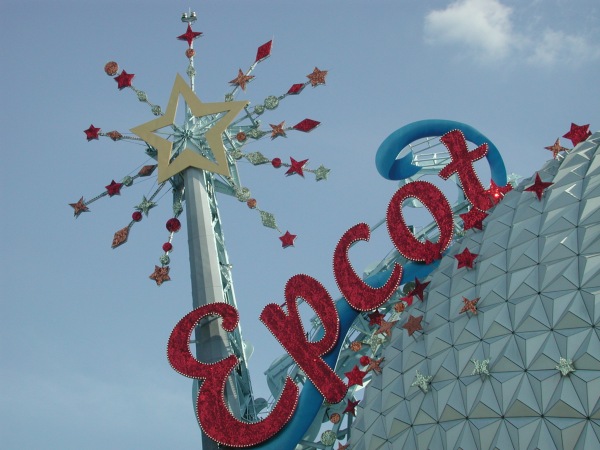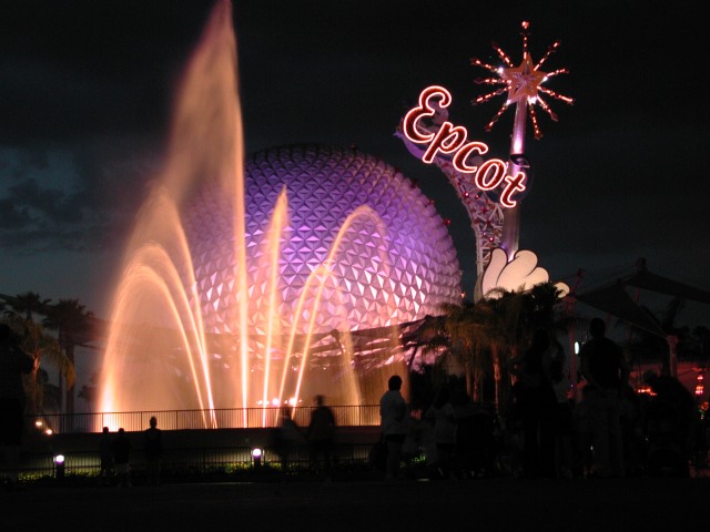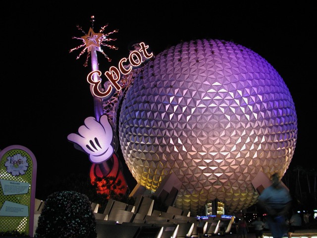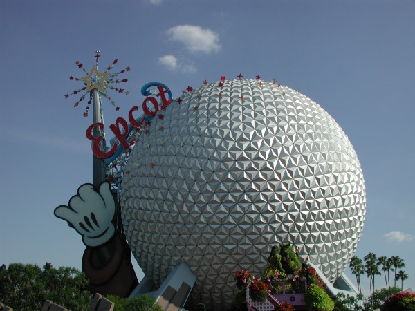We bought a few more pins at the Emporium and at the Pin Cart. Then we left due to the terrible heat and humidity. We rode the ferry back and then drove to the motel to nap. At 5pm we left for EPCOT. EPCOT was much cooler. I think it is because there is more open space for the wind to blow through. This is the new Spaceship Earth design.