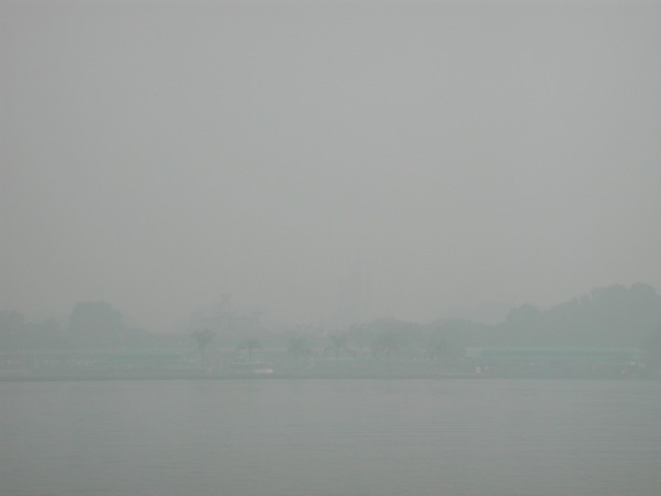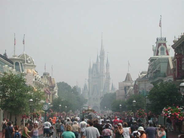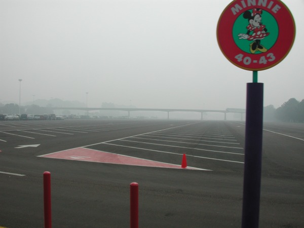 The burning smell was very strong so we shut the door and waited for the wind to blow the smoke away. By 10:15 enough smoke had blown away so we headed for the Magic Kingdom. Here is the smoke in the parking lot seen from our tram ride to the TTC.